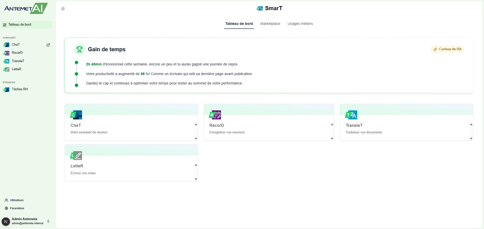 Centralized web interface for the AntemetAI suite bringing together multiple sovereign AI modules to improve business productivity.